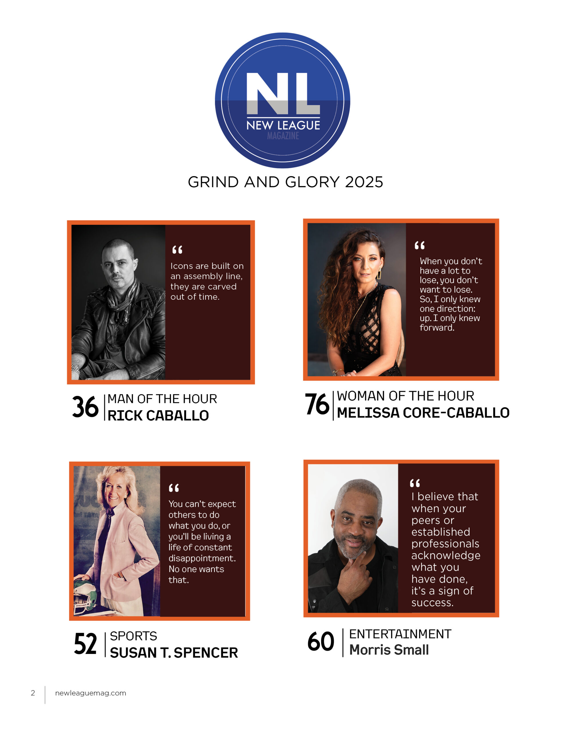The Grind & Glory edition of New League Magazine brings together the men who are shaping today’s cultural landscape through purpose, discipline, and lived experience. This issue features an in-depth cover story with internationally renowned photographer, producer, and creative leader Nigel Barker, offering rare insight into his career, influence, and the legacy he continues to build. Readers will also find a compelling profile of Susan T. Spencer, the first female General Manager in the NFL, along with a vivid look at the creative world of Rick Caballo, whose artistic vision spans music, design, and entertainment.