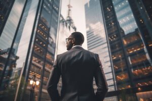 Back view of an African-American businessman in a formal suit against the backdrop of skyscrapers in the business district of the city.