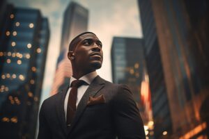 Close-up of an African-American businessman in a formal suit against the backdrop of skyscrapers in the business district of the city.